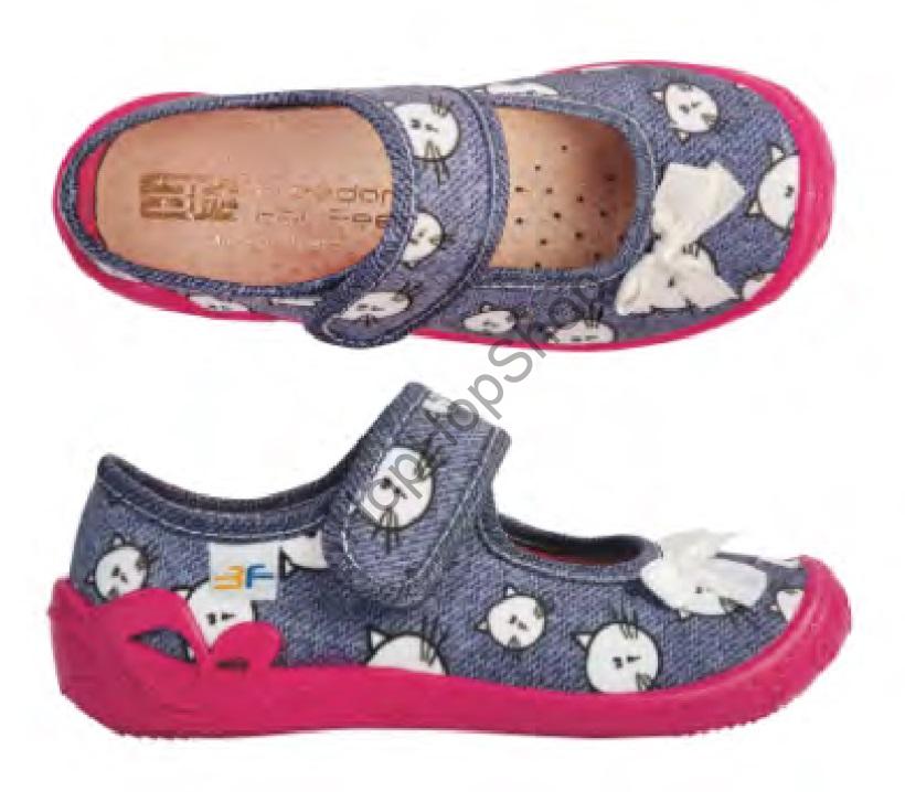Modré dívčí bačkůrky s motivem kočiček od výrobce 3F se zapínáním na jeden suchý zip.