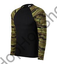 Triko s dlouhými raglánovými rukávy v barvách černá / camouflage, střih s bočními švy. Lem průkrčníku z žebrového úpletu 1:1 s 5 % elastanu, vnitřní část průkrčníku začištěná páskou v černé barvě. Zpevnění ramenních švů páskou.