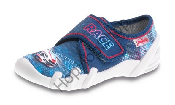 Chlapecké bačkorky Befado Skate 273X222 se závodnickým motivem mají lehkou, pružnou podrážku, pevnou vyztuženou patu a dostatečně širokou špičku.