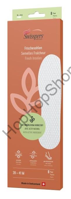 Swisspers díky svým maximálním absorpčním vlastnostem vytvářejí celodenní příjemné klima a pocit svěžesti v botách. Jemná vůně s dlouhotrvající výdrží eliminuje nepříjemný odér. Mikrokapsle postupně uvolňují přírodní účinné látky, které působí proti tvorbě zápachu v botě. Swisspers jsou tenké max. 1,4 mm a tedy vhodné do jakékoliv obuvi bez nutnosti dalšího zastřihování. Chrání vnitřek boty před vsakováním potu a tím prodlužují její životnost.