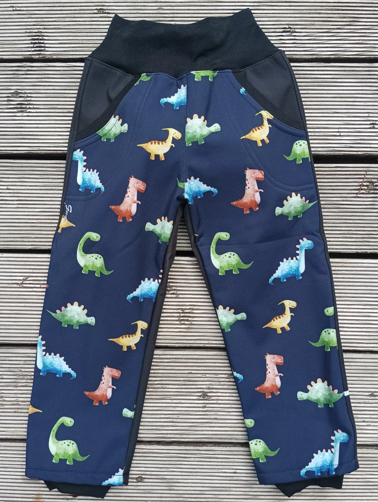 Zimní SOFTSHELLOVÉ kalhoty se vzorem DINO. Na vnitřní straně je fleecová vrstva. V pase mají kalhoty náplet s gumou s možností stáhnutí. Na jedné nohavici je na zadní straně aplikován reflexní pásek.