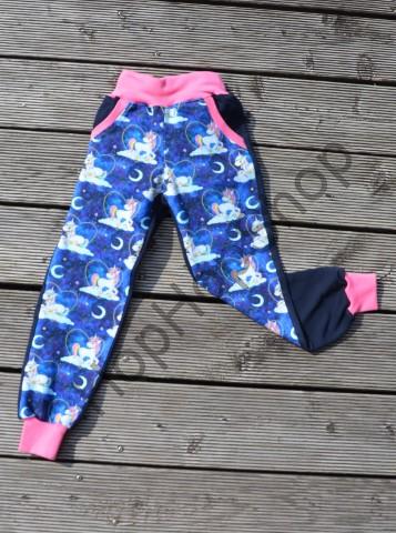 Bavlněné tepláky značky GUDO - přední strana s motivem jednorožců, zadní strana tmavě modrá (navy) s náplety okolo pasu a na nohavicích - jsou velmi pohodné a příjemné na nošení.
