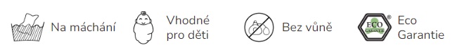 Netestováno na zvířatech. Výrobek neobsahuje ropné deriváty, fosfonáty, chlór, enzymy, optické rozjasňovače, syntetické parfémy ani barviva.